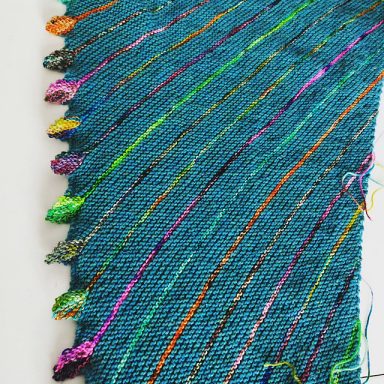 Lors du stage vous teindrez un blank qui est une bande tricotée avec des teintures étuvables. Vous pouvez soit faire une teinture improvisée comme sur la photo ou alors choisir de réaliser un dégradé ou des rayures.