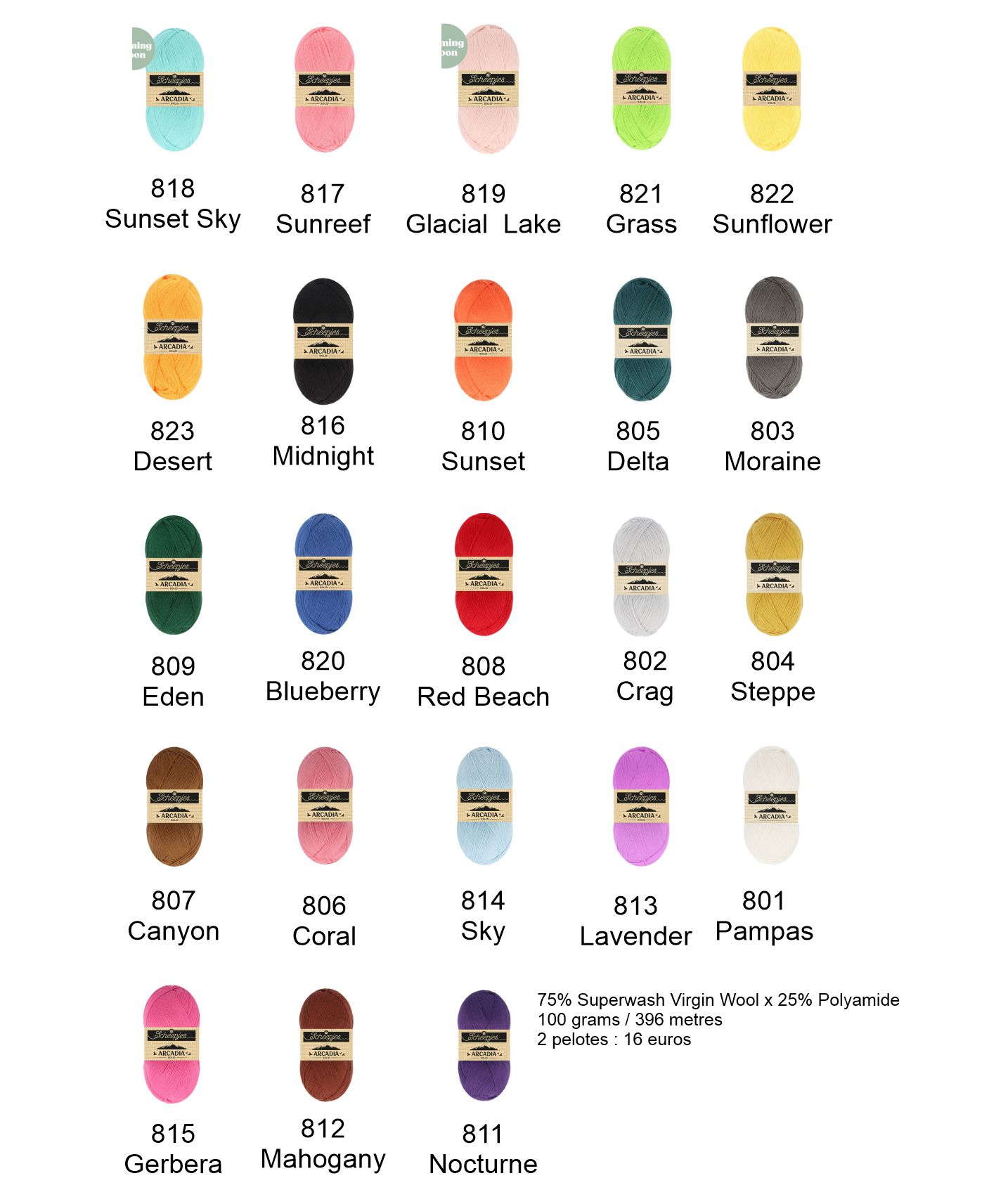Soit 2 pelotes de Arcadia Scheepjes : 75% Superwash Virgin Wool x 25% Polyamide, 100 grams / 396 metres